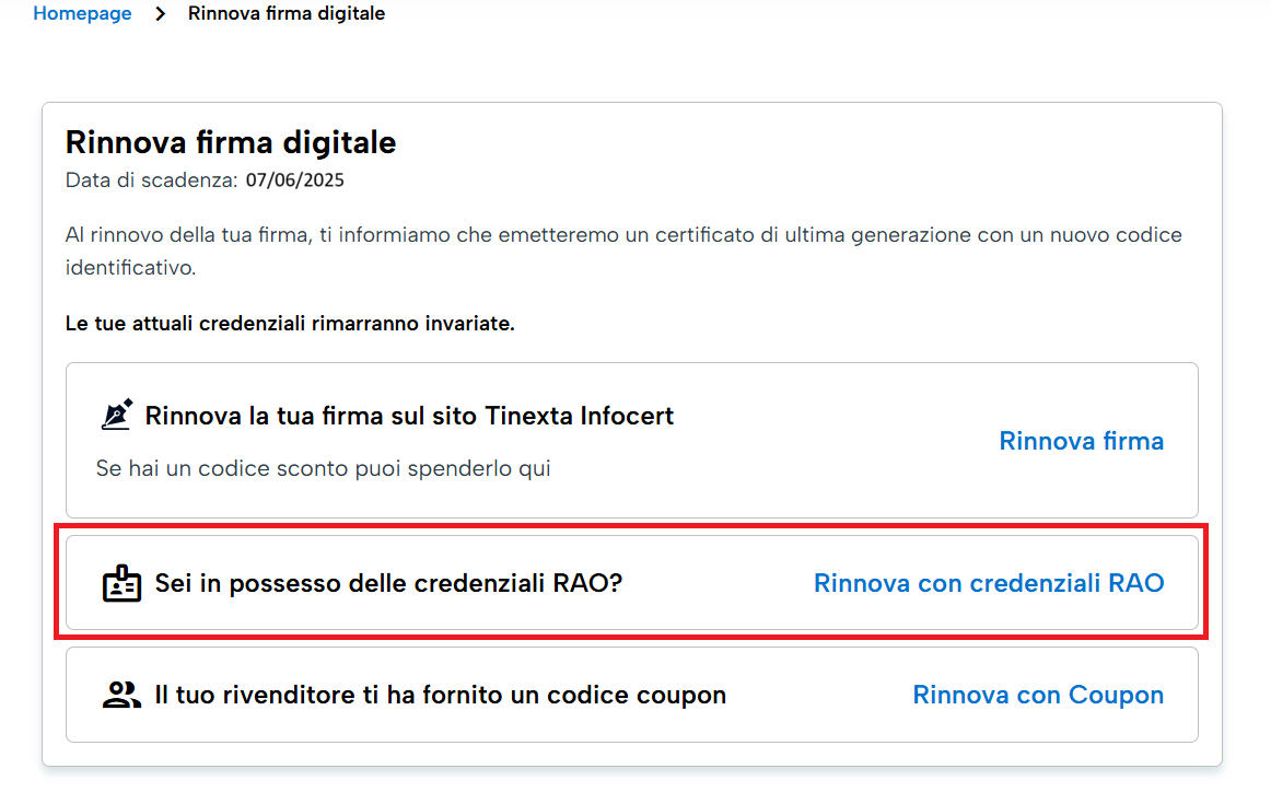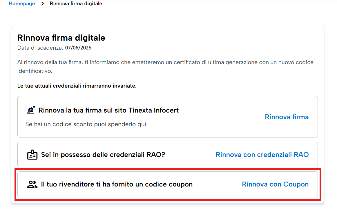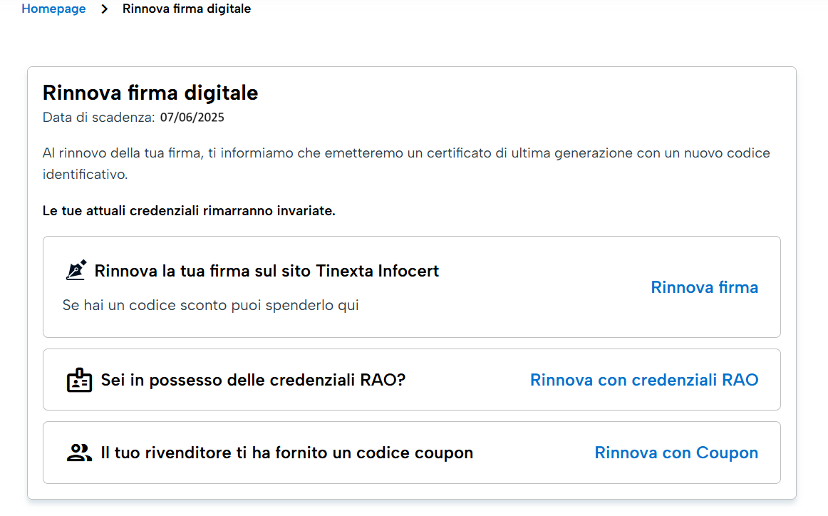 Le opzioni offerte prevedono l’acquisto diretto sul negozio InfoCert, l’utilizzo di un coupon o, in alternativa, il rinnovo presso l'ufficio di registrazione che ha provveduto al rilascio, il cui operatore procederà inserendo le sue credenziali RAO.