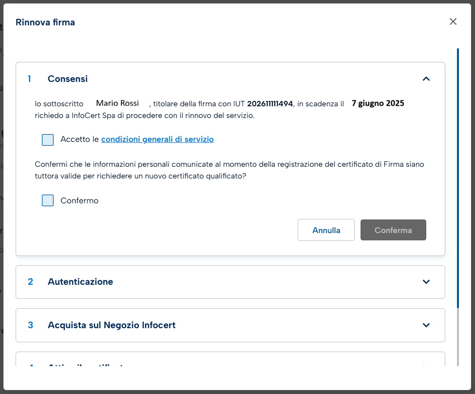 Innanzitutto, viene richiesto di confermare il permanere delle informazioni comunicate ad InfoCert nel momento del rilascio, facendo particolare attenzione a quelle che vengono pubblicate con il certificato stesso: nome, cognome e IUT.