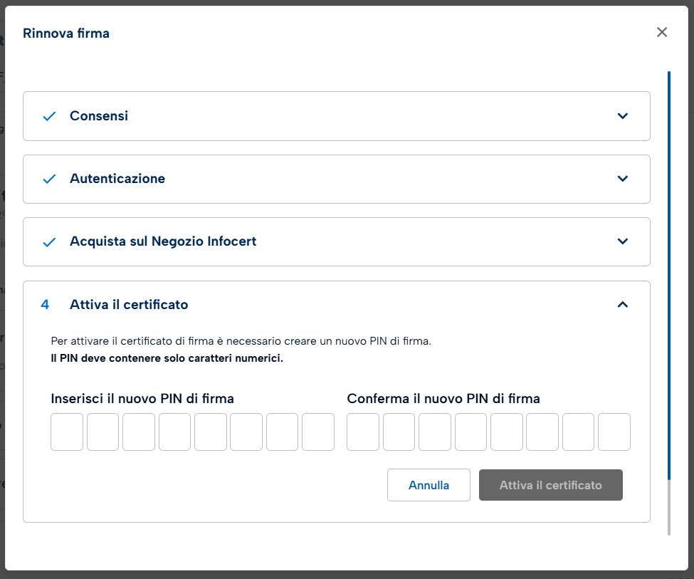 Se le informazioni fornite al momento del rilascio sono tutt’ora valide, è possibile continuare la richiesta di rinnovo inserendo il PIN e selezionando l’opzione Conferma.