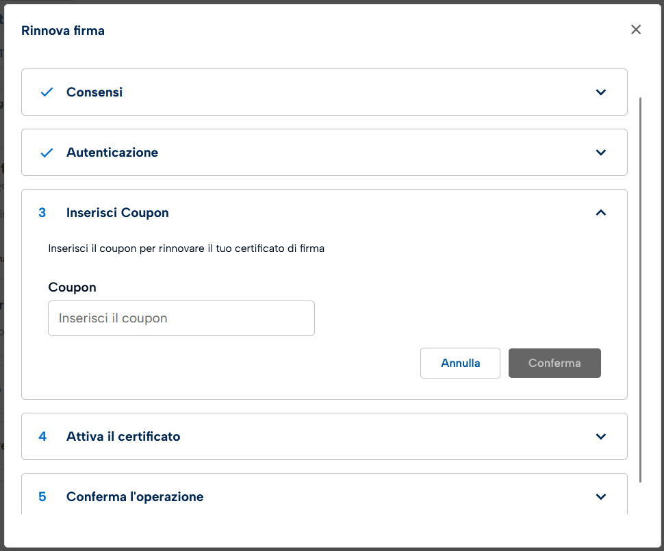 Dopo i passaggi relativi all’accettazione dei consensi e alla conferma dell’operazione tramite inserimento codice OTP, sarà sufficiente inserire il codice alfanumerico che identifica il coupon assegnato nel campo Coupon e proseguire con un clic sul pulsante Conferma.