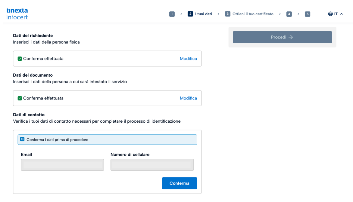 Verranno poi richiesti i dati di contatto: telefono cellulare e indirizzo e-mail.