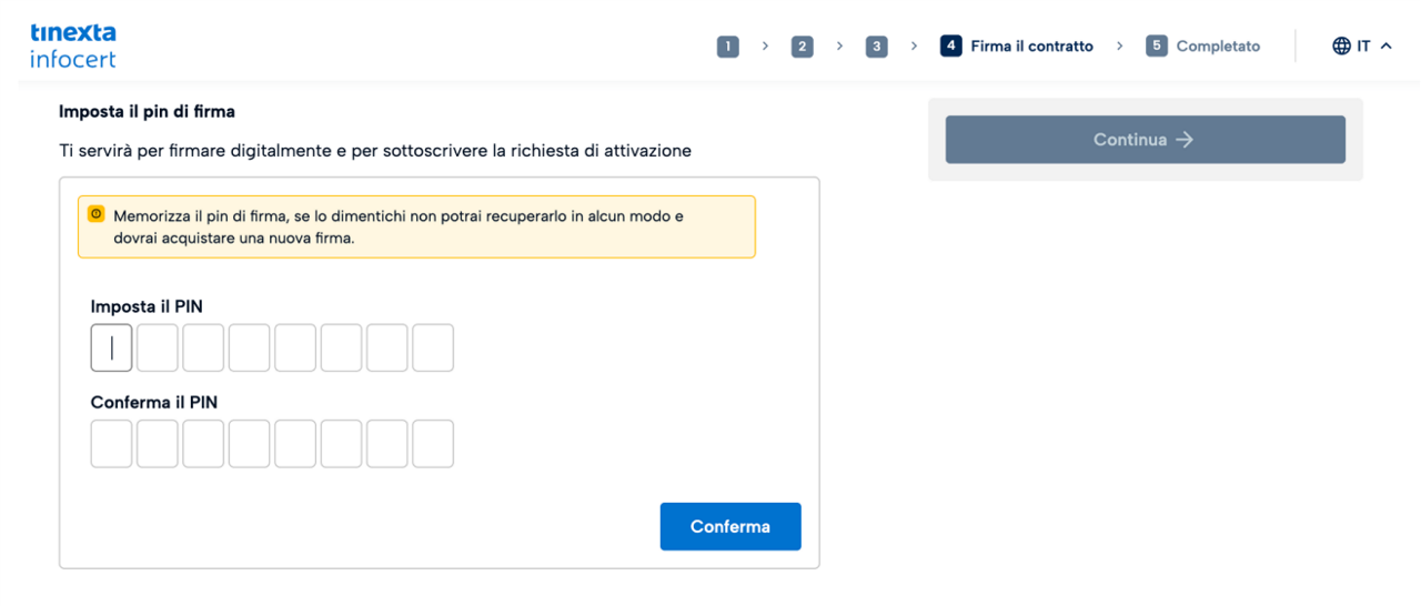 Dopo aver impostato il PIN di firma arriverà sul cellulare fornito l’OTP per completare la richiesta di identificazione.