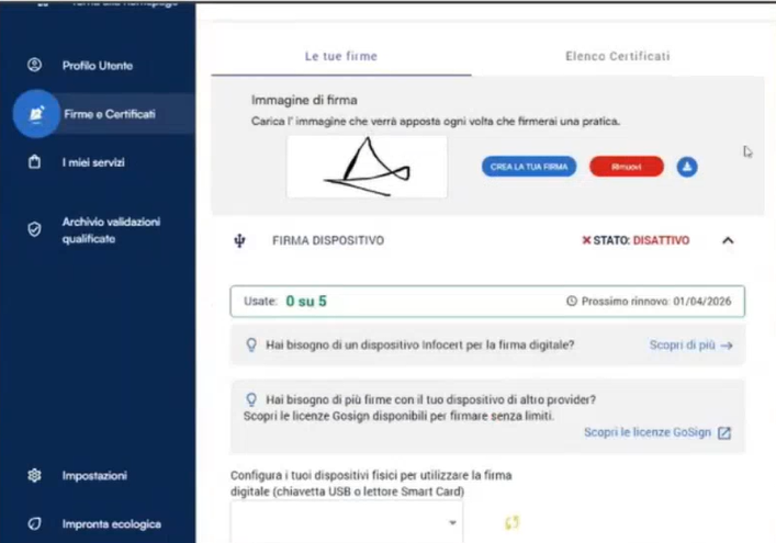 Dopo l’acquisto accedere a GoSign Desktop per l’attivazione del dispositivo, cliccando nel menu laterale sulla voce Firme e certificati.