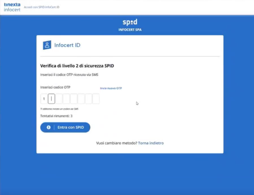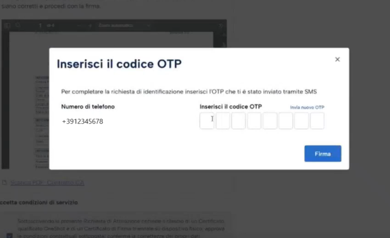 Si riceverà un codice OTP sul numero di telefono fornito, per la firma one-shot del documento.