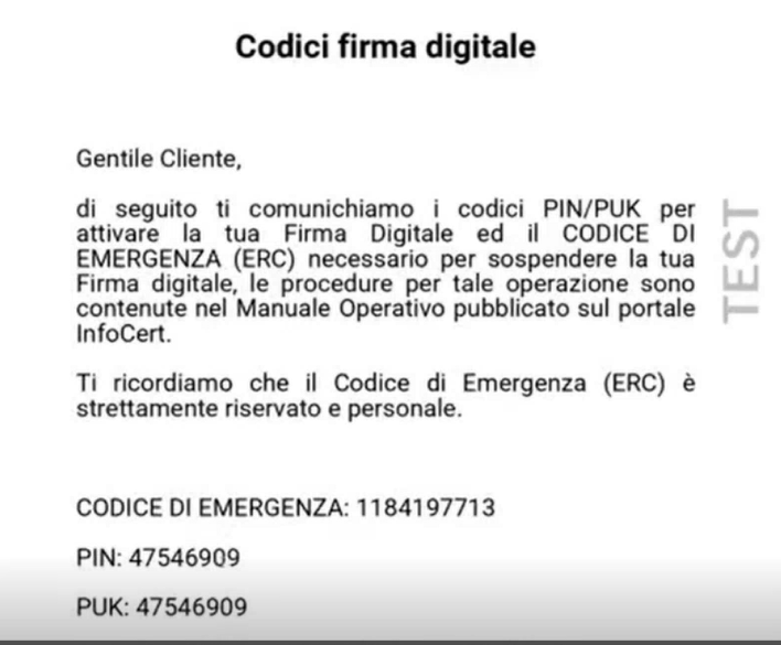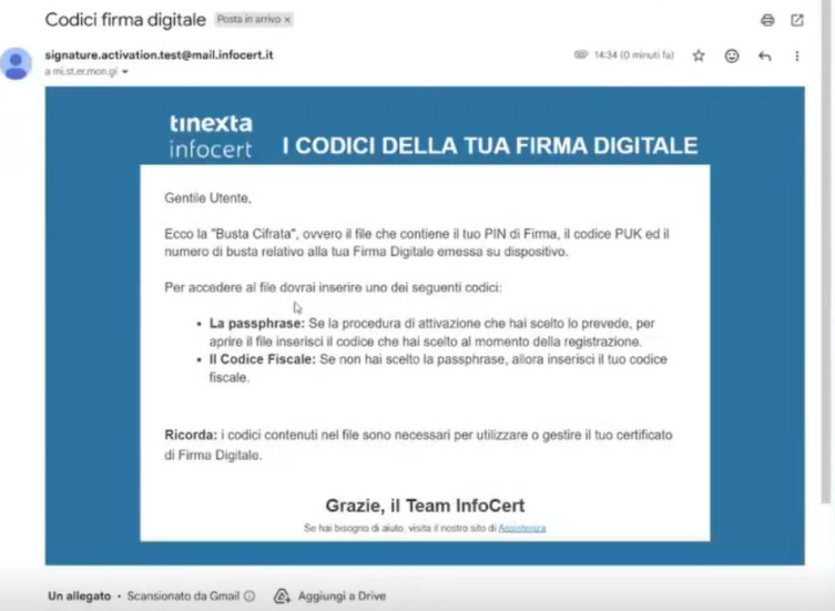 Dopo aver completato la procedura di registrazione si riceverà una e-mail contenente il file con i Codici di attivazione della tua Firma Digitale, contiene i codici PIN e PUK ed è accessibile tramite la passphrase.
