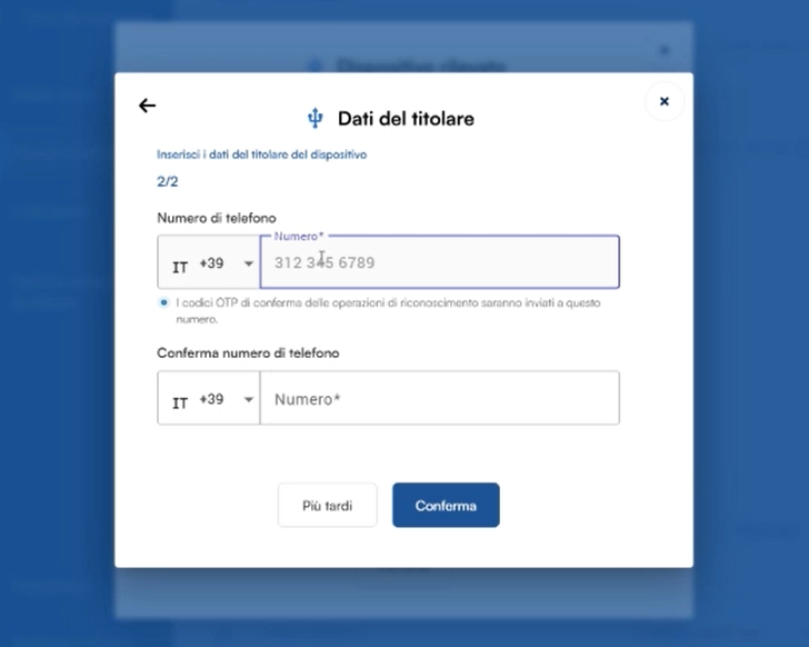 Inserire l’OTP e proseguire con l’inserimento del numero di telefono del titolare.