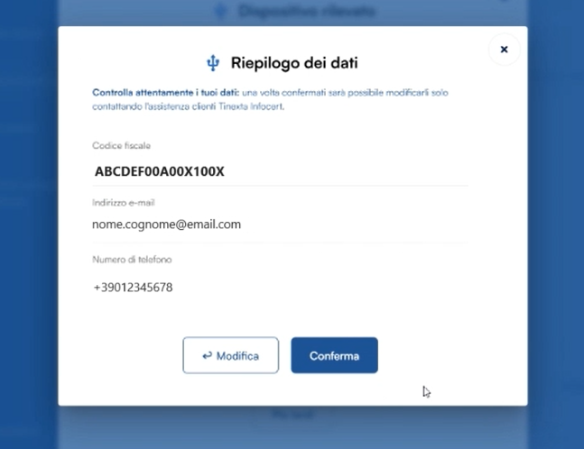 Cliccare su Conferma e controllare il riepilogo dati forniti.
