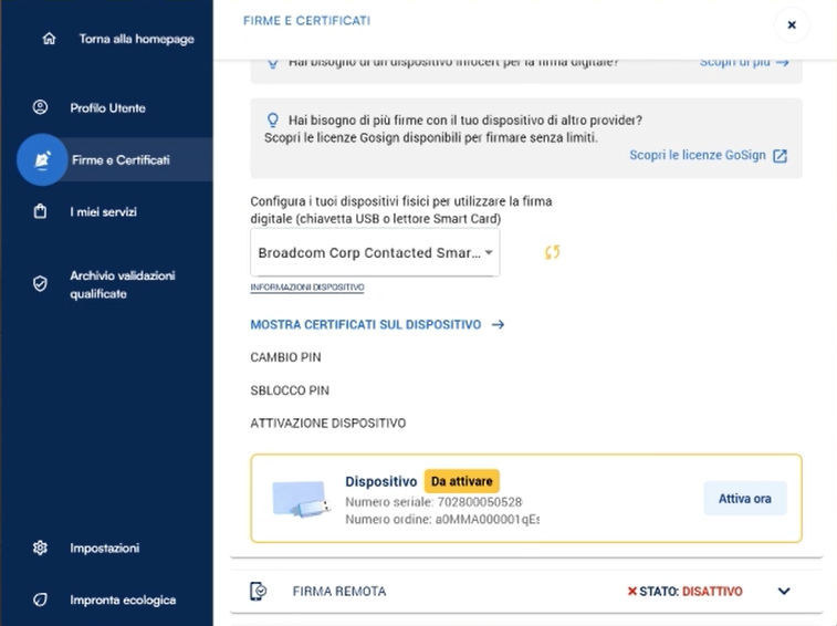 In GoSign Desktop, nella sezione Firme e Certificati sarà visibile il dispositivo attivo.