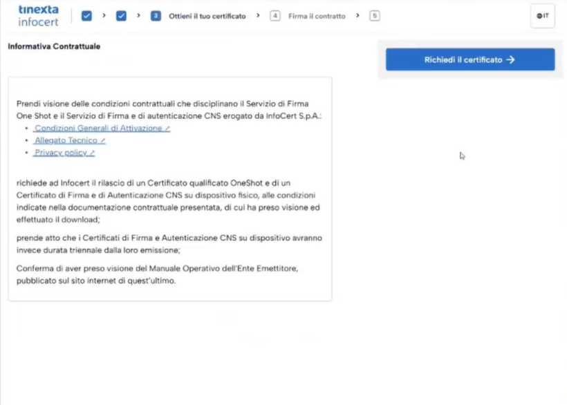 Una volta generato il certificato è necessario prendere visione delle "Condizioni Contrattuali" e proseguire cliccando su Richiedi il certificato.