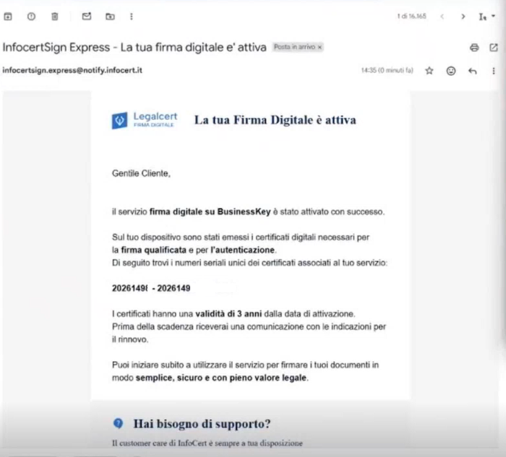 Una e-mail confermerà la corretta attivazione del certificato di firma.