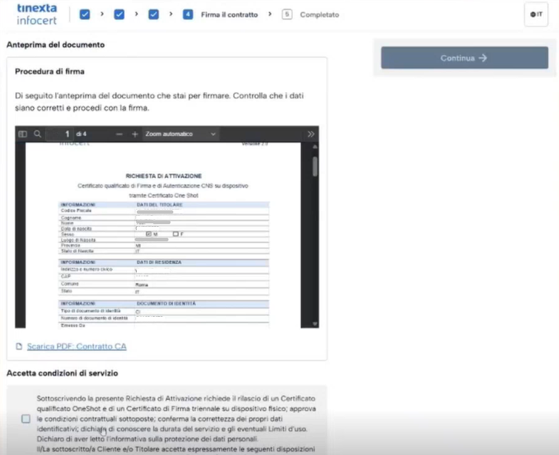 Controllare dall’anteprima la correttezza dei dati inseriti, accettare le Condizioni di Servizio spuntando la casella posta in basso e poi su Continua per proseguire