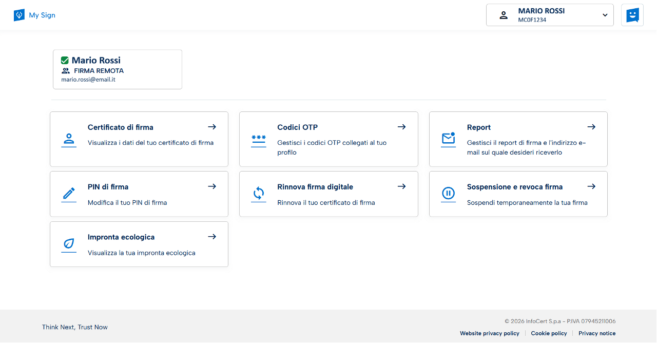 Cliccare su Accedi a My Sign per la gestione del certificato utilizzando le credenziali dell’account InfoCert.