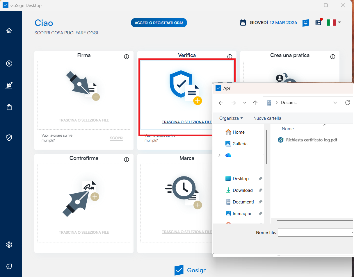 GoSign Desktop mette a disposizione nella home page l’opzione "Verifica" che mi permette di selezionare il file di log e di richiamarlo all’interno del software.