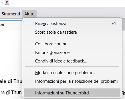 Un clic sul comando di menu Aiuto mi permette di visualizzare le possibili opzioni e di selezionare la voce Informazioni su Thunderbird.