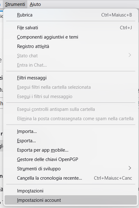 Per configurare un nuovo account di posta seleziono la voce Strumenti nella barra del menu e scelgo la funzione Impostazioni Account.