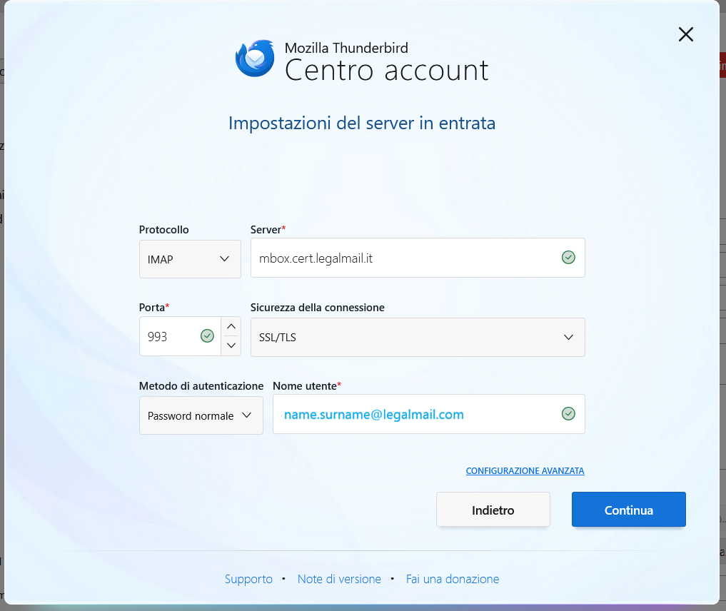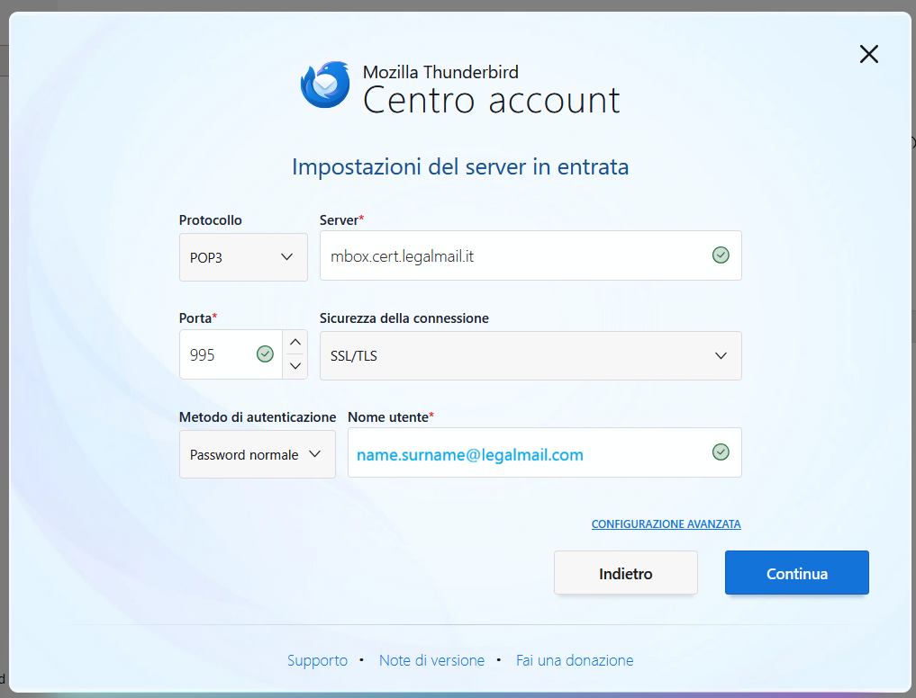 Successivamente, inserire le informazioni necessarie per la corretta configurazione del server di posta in entrata.