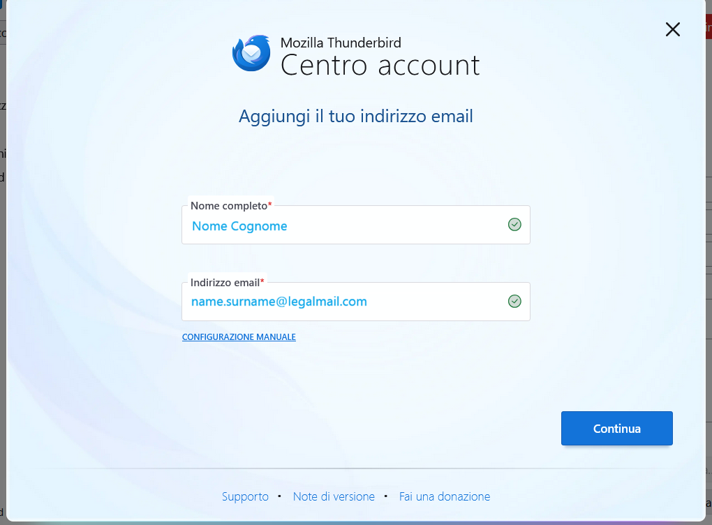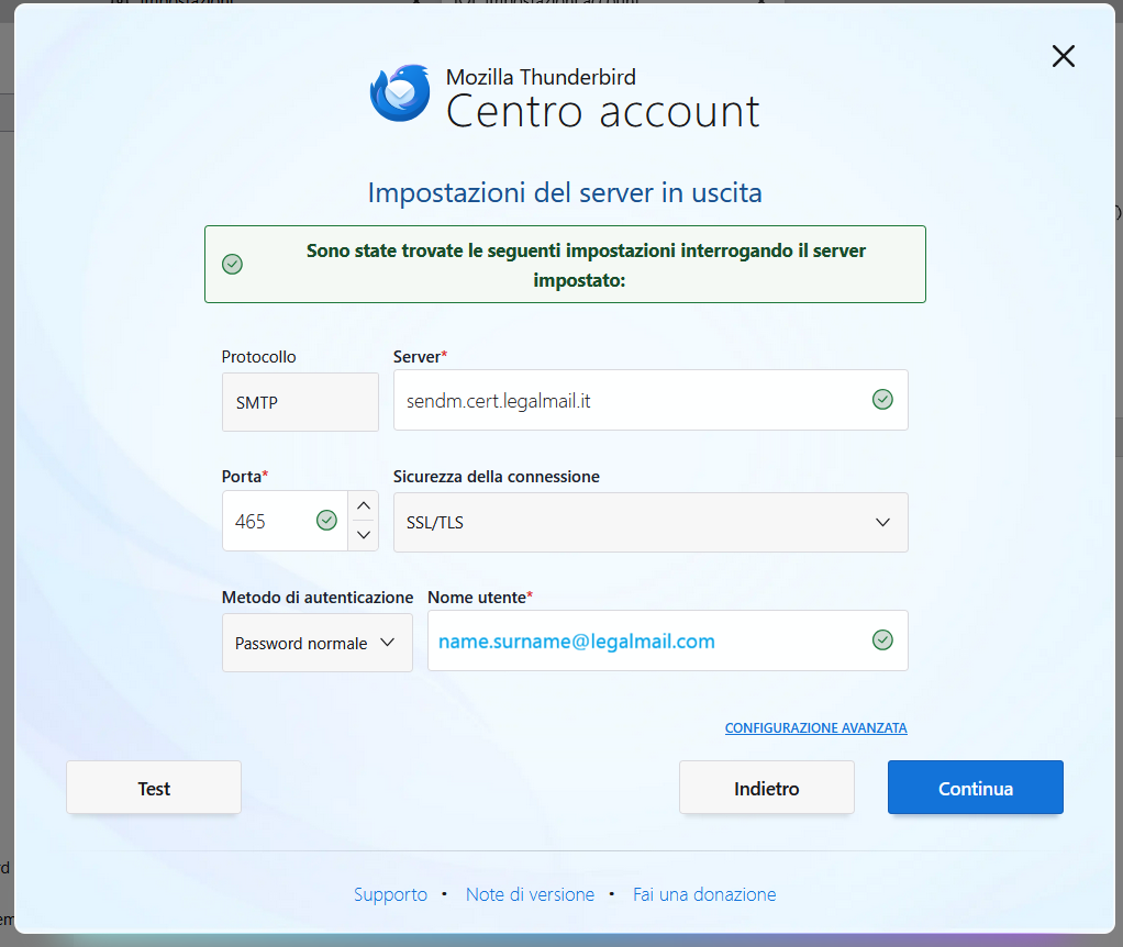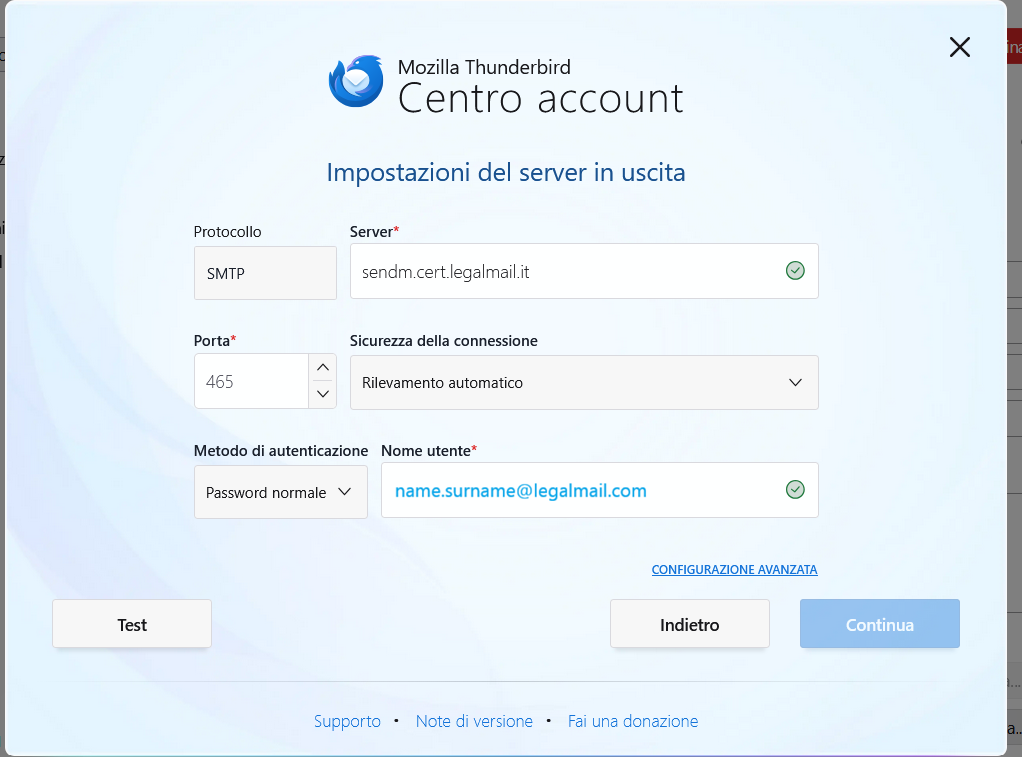 Mozilla Thunderbird mi propone un form all'interno del quale inserire i dati necessari per la configurazione della mia casella PEC, in particolare l'indirizzo di posta e il Nome, ovvero la descrizione del mio indirizzo che desidero venga visualizzata dai miei interlocutori nel campo DA: (il messaggio proviene da:).