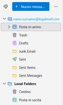 Il nuovo account di posta creato è visibile sul lato sinistro dello schermo.