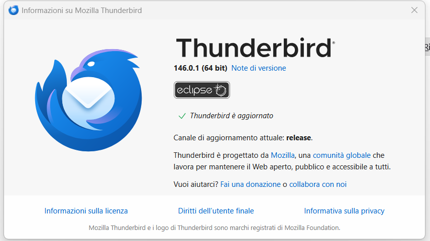 Se la versione installata sul mio computer non è l'ultima disponibile, mi verrà proposta l'installazione dell'aggiornamento, altrimenti il sistema mi dirà che Thunderbird è aggiornato.