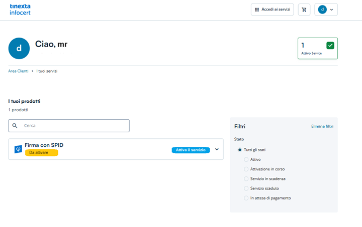 Il servizio “Firma con Spid” appena acquistato sarà visualizzabile all’interno del menu nella voce I miei servizi.