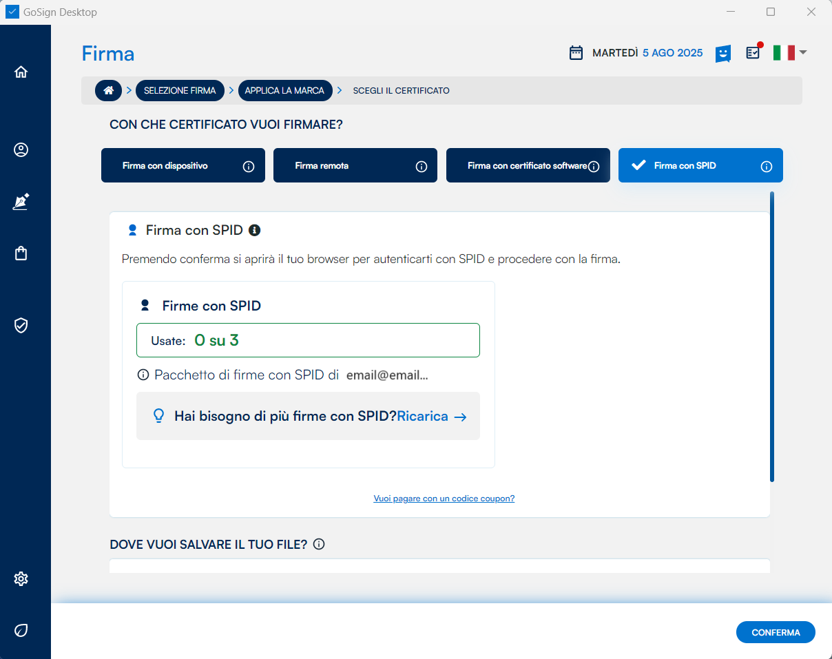 Il processo di firma, una volta selezionato il certificato di firma, sarà lo stesso per entrambe le opzioni (associazione account e utilizzo coupon di firma).