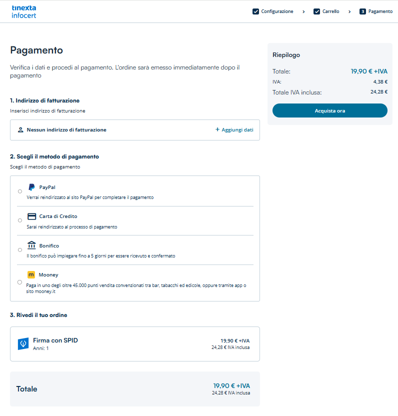 Per prima cosa è necessario procedere all’acquisto del pacchetto “Firma con SPID”: si tratta di un pacchetto composto da un minimo di 3 firme one-shot o multipli di 3. Una volta aggiunto il prodotto al carrello e apposto il flag sull’accettazione dei “Termini e condizioni del servizio”, è possibile cliccare su Aggiungi e vai al carrello.