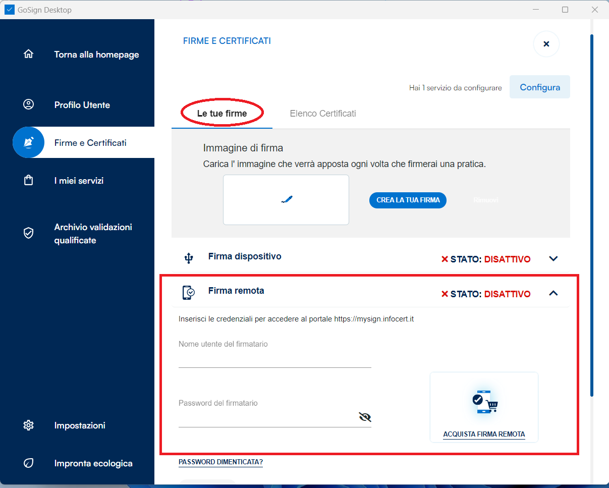 Se ho un certificato di firma remota, come prima cosa devo inserire le mie credenziali. Dal menu laterale sarà sufficiente selezionare l'opzione Firme e certificati
