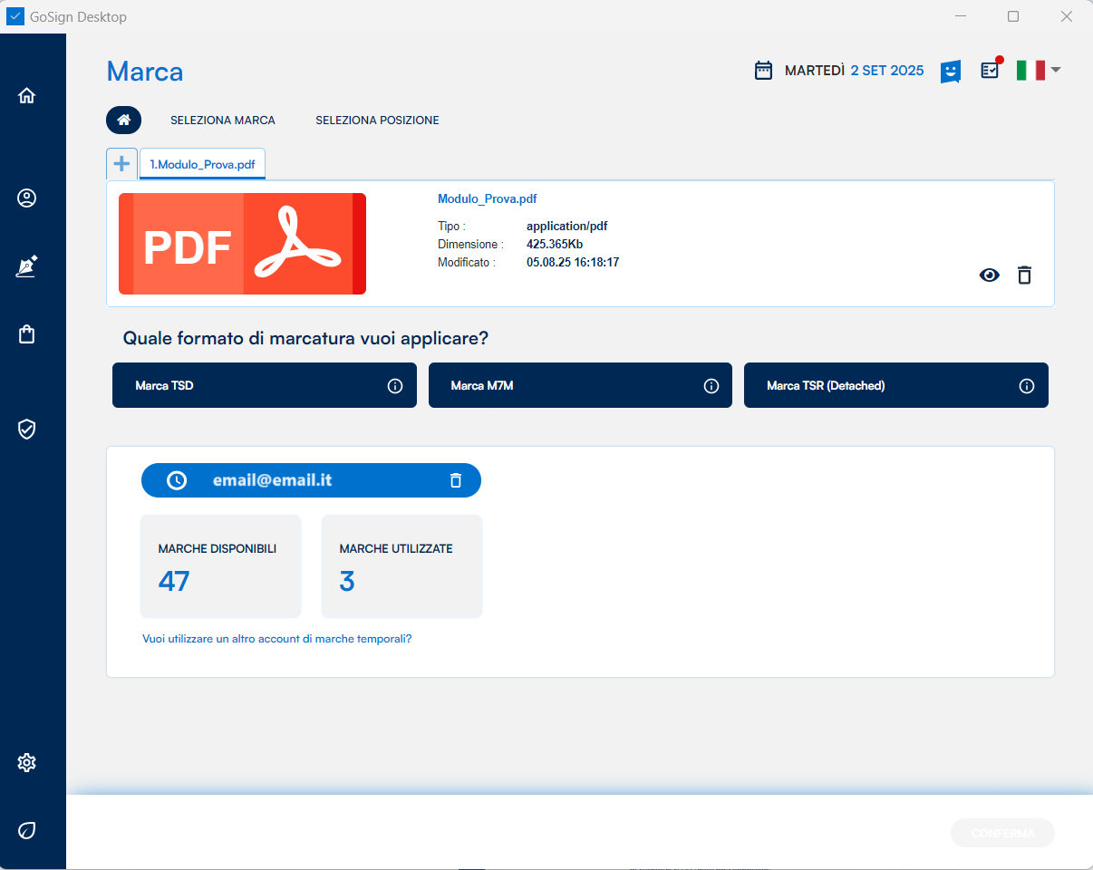 Una volta scelto se si voglia o meno apporre una marca temporale è necessario premere sul pulsante Conferma per procedere alla fase successiva.