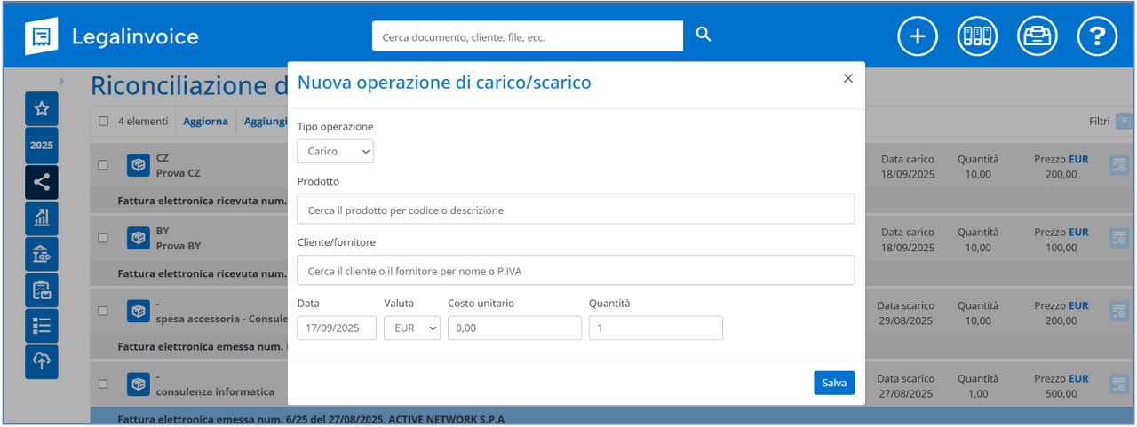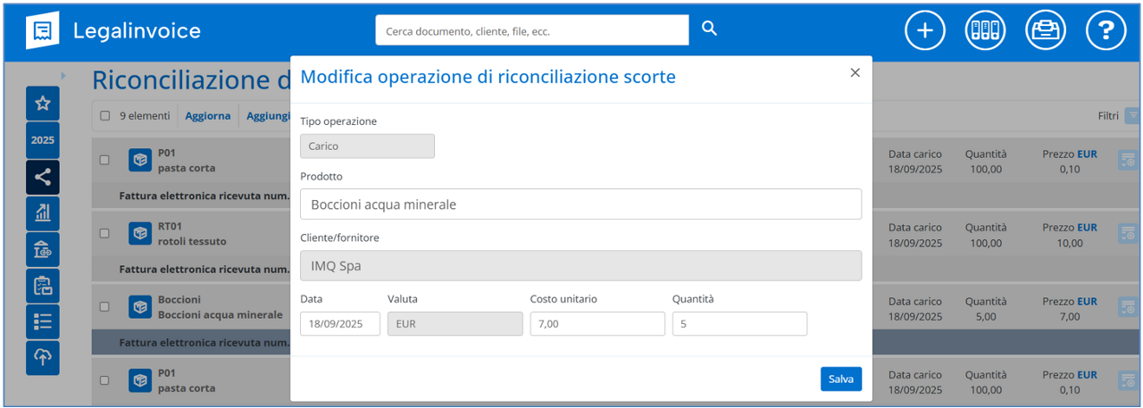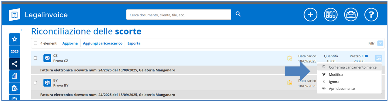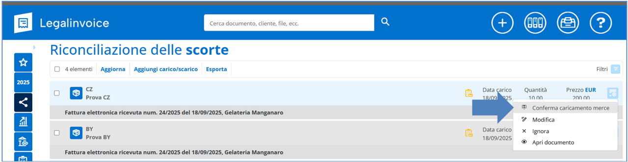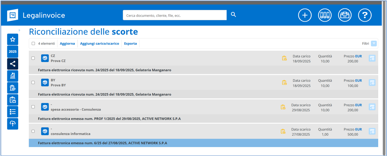 Con la ricezione della fatture passive si va ad alimentare la gestione delle scorte nel magazzino. Il carico delle scorte avviene tramite la funzione di Riconciliazione delle scorte, accessibile sia dalla barra laterale