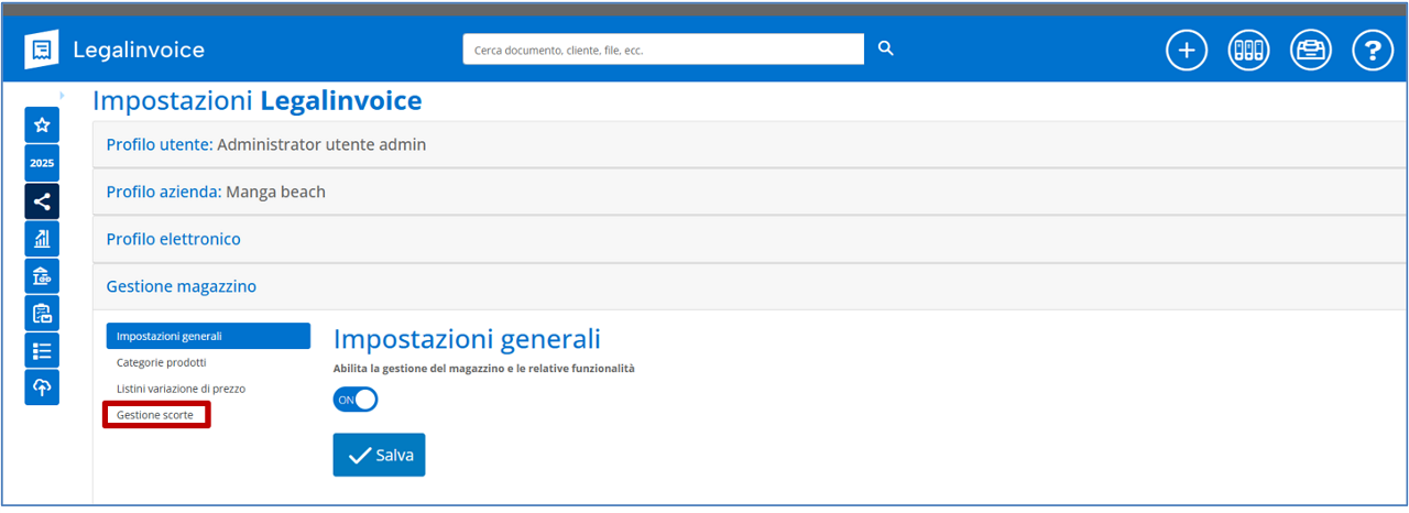 Dopo aver abilitato il Magazzino, aver creato le categorie prodotto e i Listini variazione prezzo (cfr. sezione Multilistino), è necessario abilitare la funzione Gestione scorte: