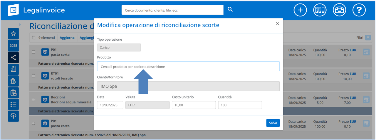 Se un prodotto è già in anagrafica, al fine di abbinare le scorte provenienti dal fornitore al prodotto giusto, è possibile utilizzare la funzione MODIFICA: