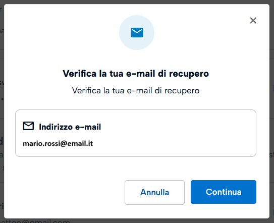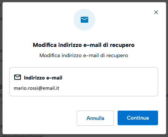 Cliccando sul riquadro Indirizzo email di recupero sul pulsante Modifica confermare l'operazione cliccando su Continua.