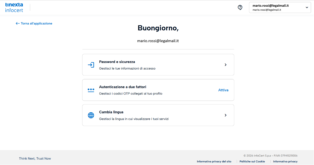 Si viene reindirizzati sulla [pagina](My Account) (https://myaccount.infocert.it/dashboard) dove è possibile gestire e modificare i riferimenti legati all'account PEC Legalmail in uso.