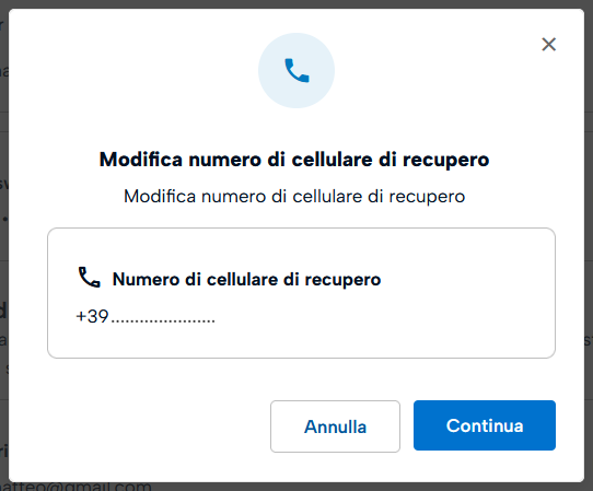 Cliccando sul riquadro Numero di Cellulare di recupero sul pulsante Modifica confermare l'operazione cliccando su Continua.