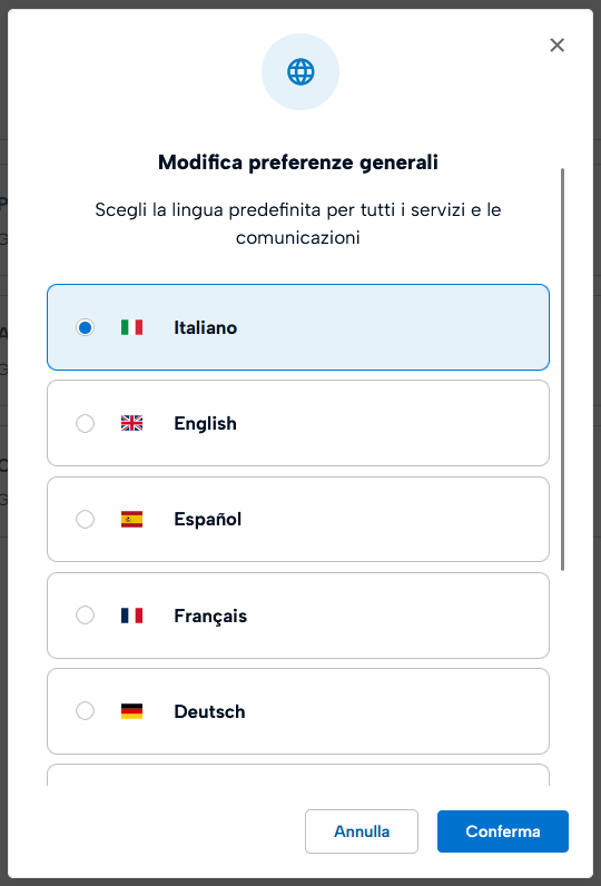 Cliccando sul riquadro Cambia lingua possiamo modificare la lingua dell'applicativo in uso (My Account) nonché quella di utilizzo della PEC Legalmail.