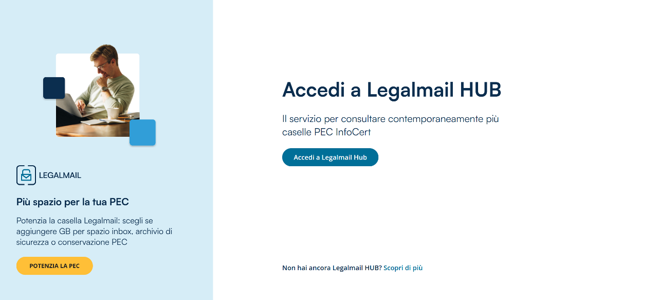 Collegati con la pagina di accesso al servizio Legalmail HUB e inserisci nei campi predisposti la User ID e la password fornite da InfoCert successivamente all'acquisto.