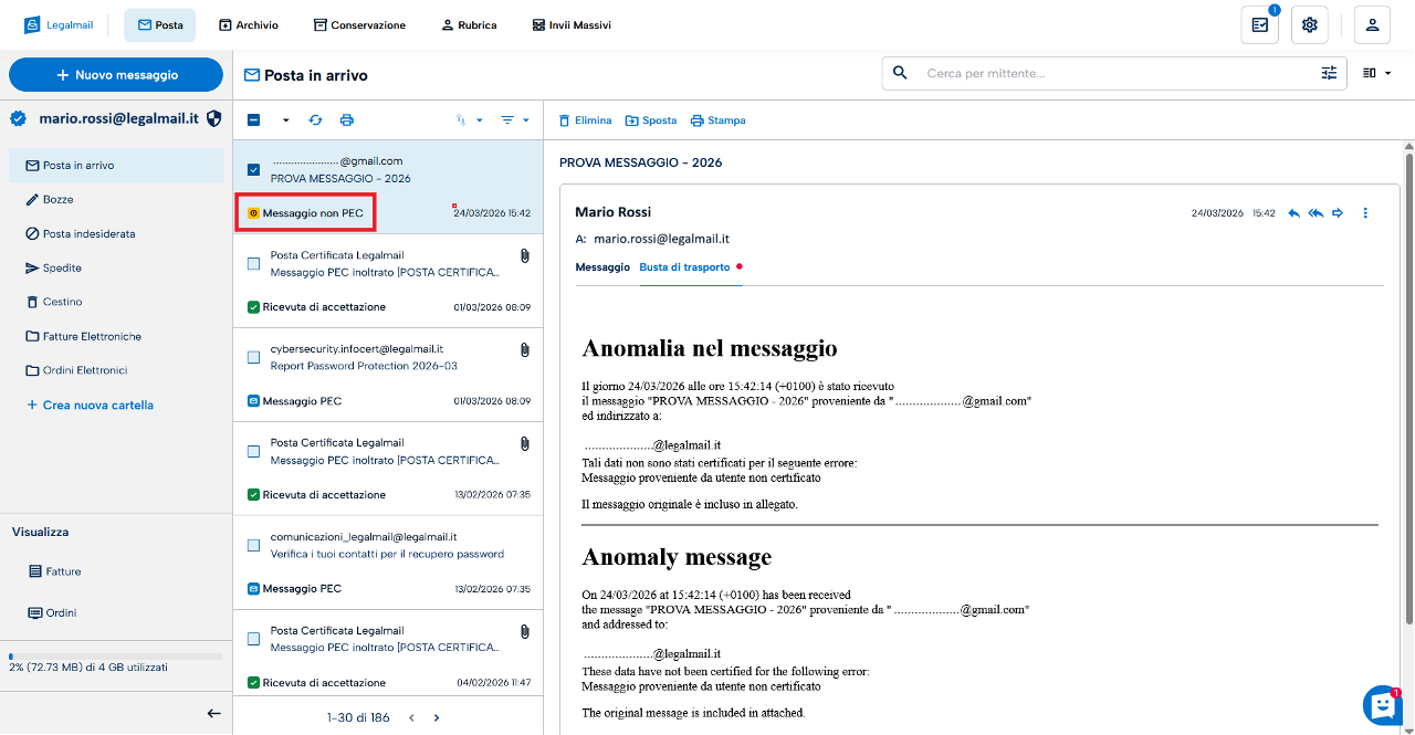 Quando sulla tua casella Legalmail viene recapitato un messaggio proveniente da una casella di posta normale, ricevi dal sistema Legalmail la segnalazione di anomalia dovuta alla mancanza dei requisiti di validità legale propri dei messaggi "PEC to PEC".