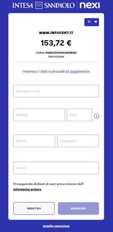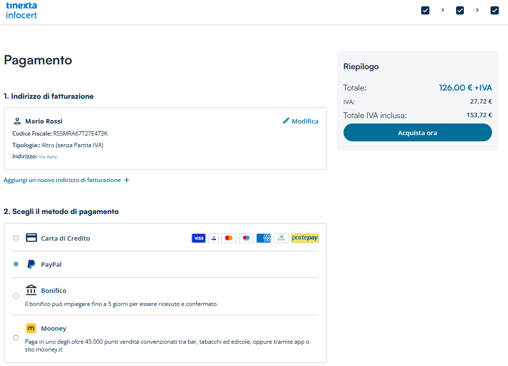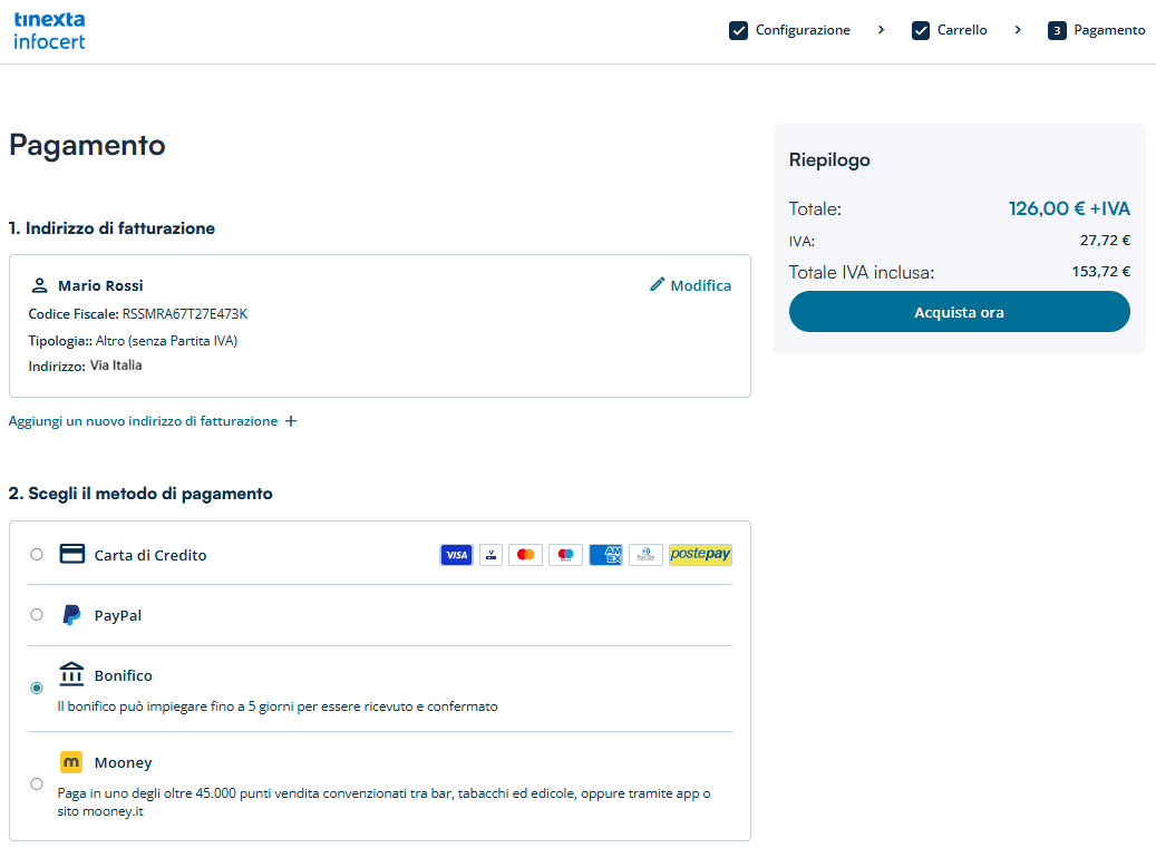 Un clic sul pulsante Acquista Ora trasferisce sul sistema di pagamento della banca di appoggio al Negozio Tinexta Infocert.