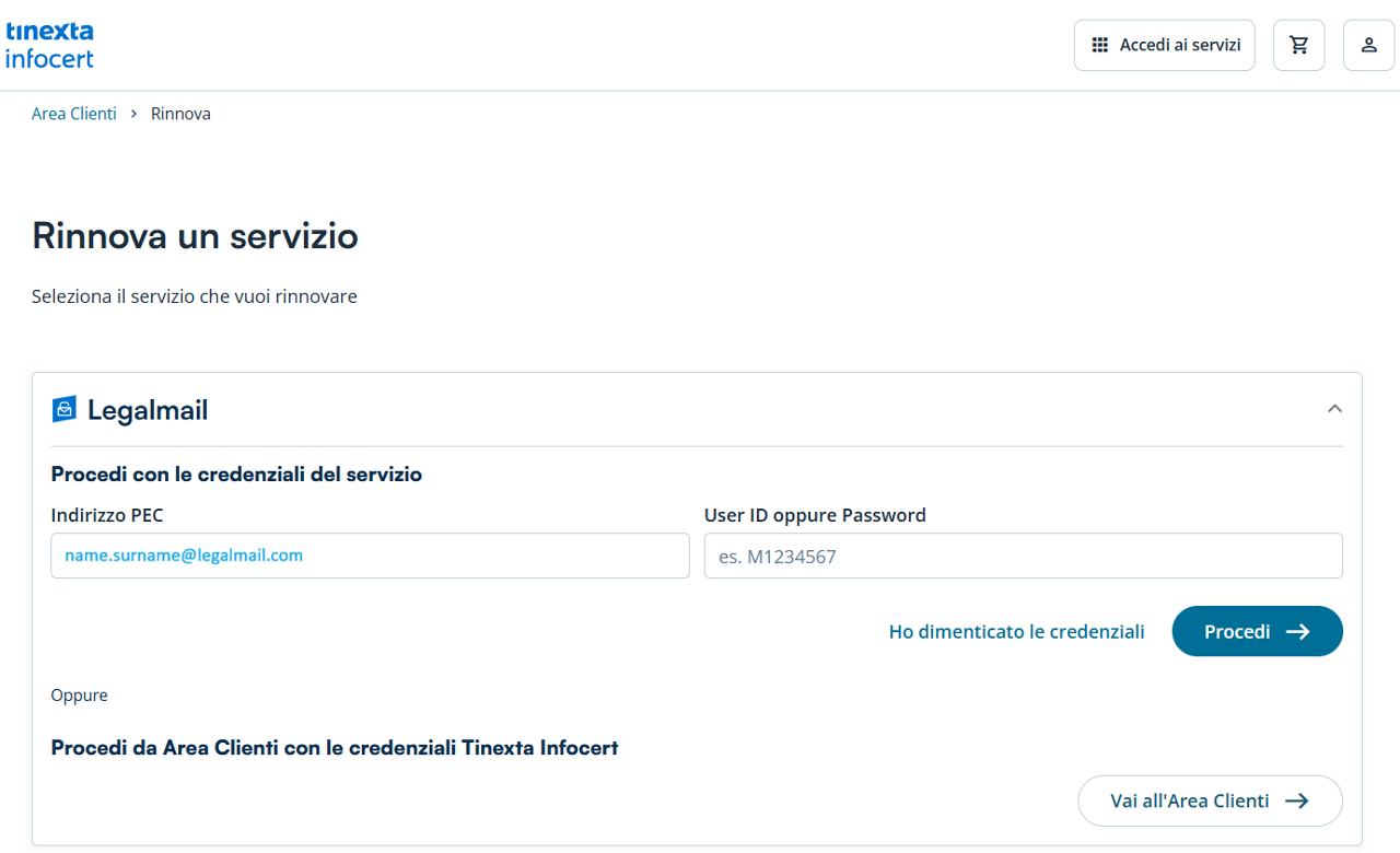 Una volta deciso di procedere con il rinnovo della casella, sarà possibile iniziare l’attività collegandosi alla pagina del sito Tinexta Infocert dedicata ai rinnovi.