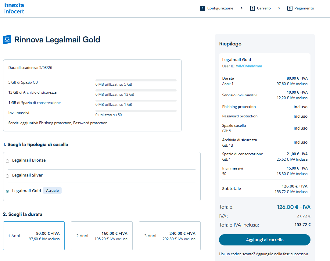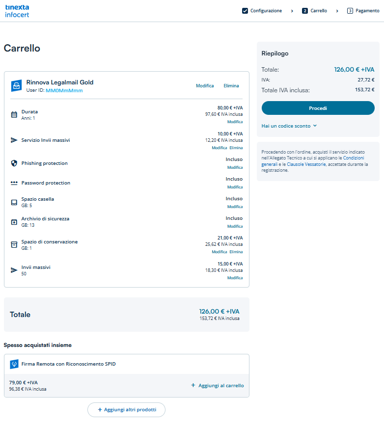 Premendo Procedi si aprirà la pagina del rinnovo con la possibilità di configurare il pacchetto in base alle proprie esigenze.