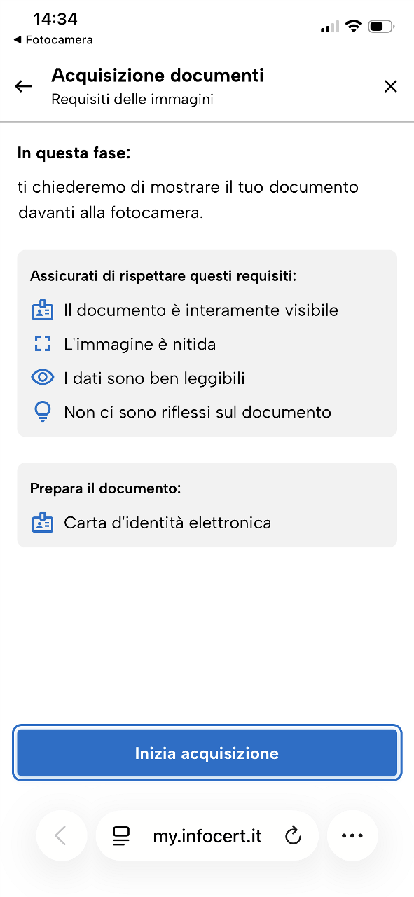 Clicca su "Inizia acquisizione" per procedere con la foto del documento.
