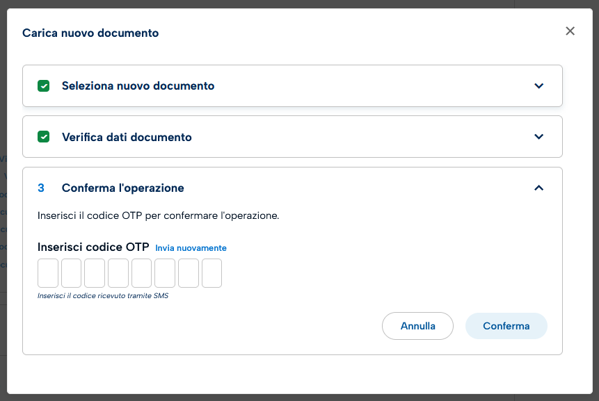 Qualora si abbia la necessità di aggiornare il Documento d'Identità, prossimo alla scadenza, è possibile intervenire utilizzando il pulsante Carica nuovo documento.
