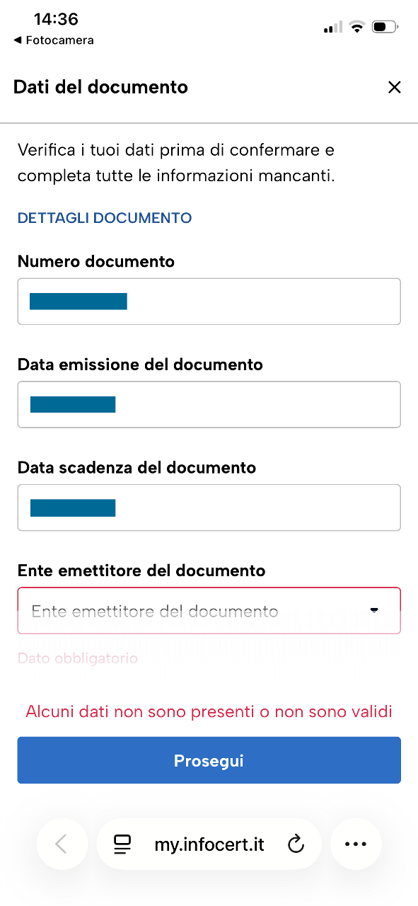 Segui le istruzioni a schermo per eseguire correttamente la foto FRONTE del documento.