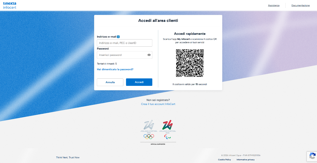 Dopo aver cliccato sul tasto Accedi o registrati sarà necessario inserire il nome utente e la relativa password o, in alternativa, scansionare il Qr-Code tramite l’App MyInfoCert.